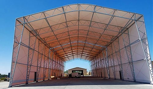 Tyndall Air Force Base Hangar Buildings Building: Three custom fabric buildings mounted on railsDimensions: 70′ x 80′Location: Tyndall Air Force Base, FloridaPurpose: Air Force hangar buildings 16060
